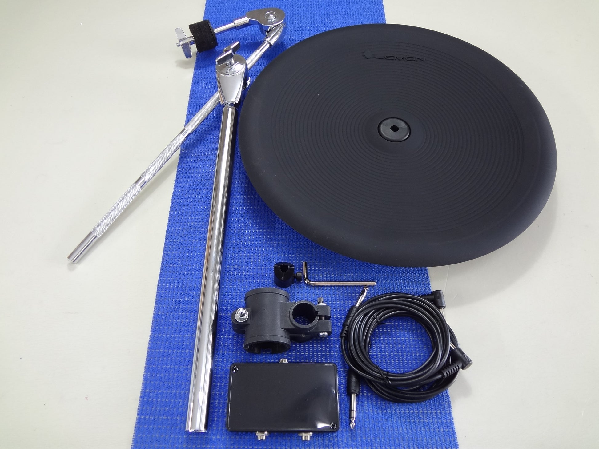 A new Lemon 15'' electronic china cymbal add on pack.It consists of a 15'' two zone china cymbal with choke, a full size boom arm, rack mounting clamp, splitter box and cables.