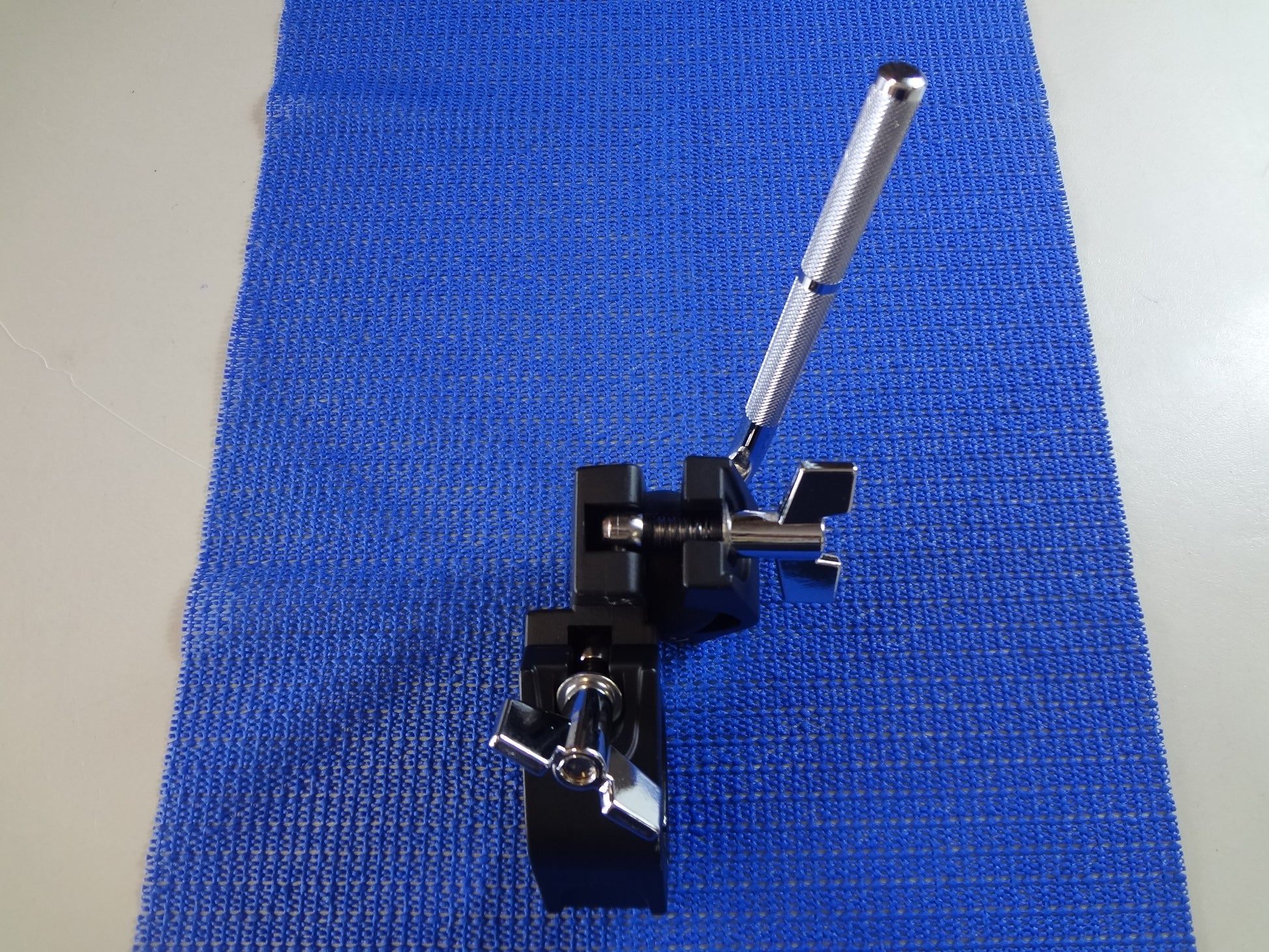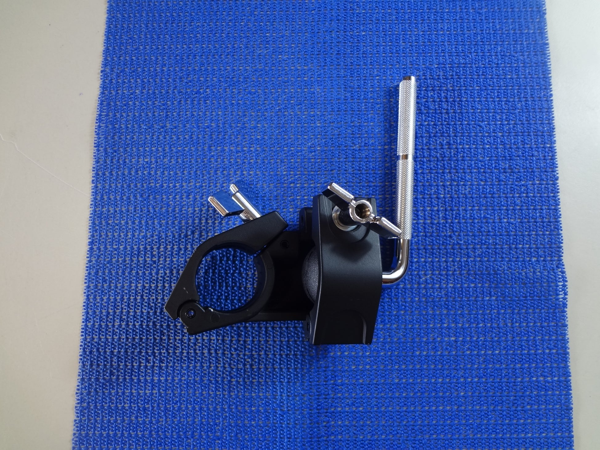 A new black metal drum rack snare clamp using a ball and socket for adjustment. It is used for the mounting of the snare drum to a rack pipe section. The clamp will fit any standard 1.5'' drum rack pipe, including most of the electronic drum racks being used today. Please check your tube size before purchasing as there is the odd brand that is not 1.5''.