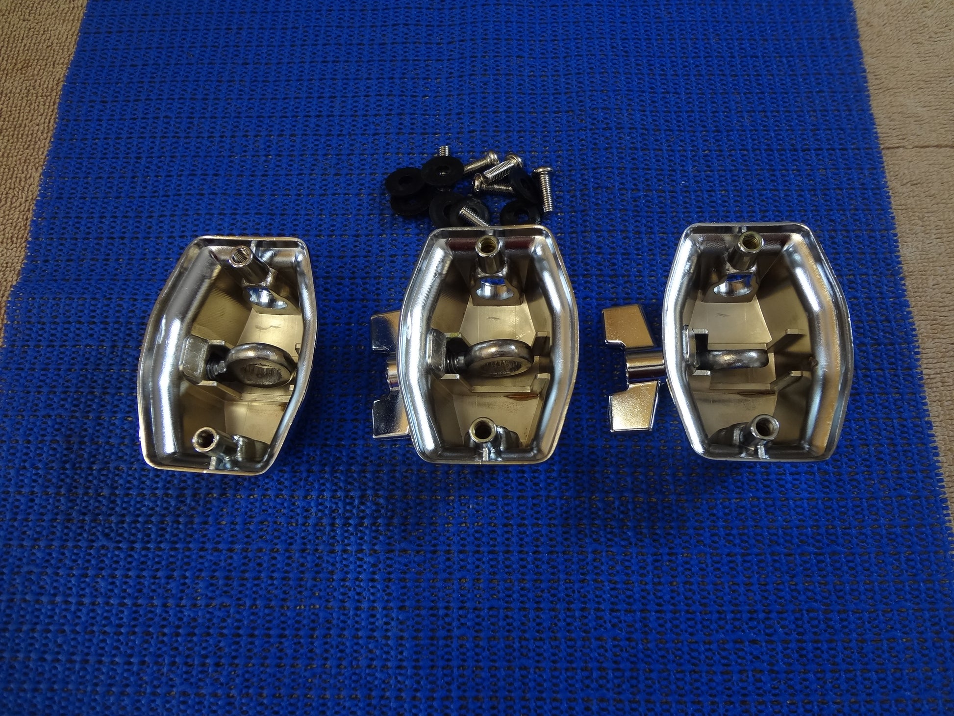 A new set of chrome tom mounts (3) these can be used as mounts for hanging toms, or for floor tom legs mounts.